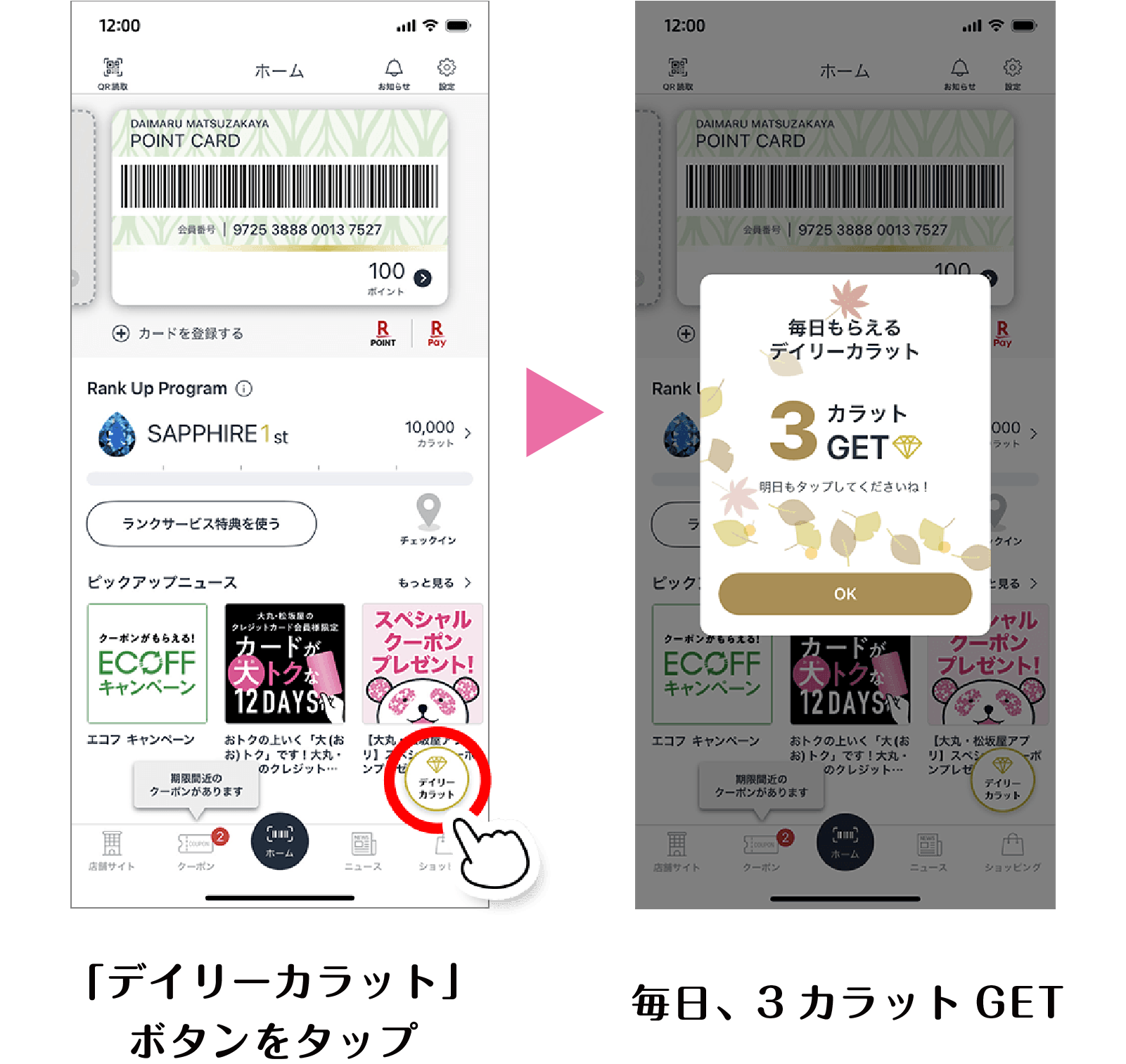 大丸・松坂屋アプリを起動しホーム画面右下の「デイリーカラット」をタップしてください。